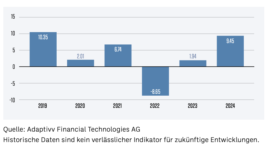 Das Portfolio erzielte in der Simulation seit Anfang 2019 eine Gesamtrendite von +22.95%. Die beste Jahresrendite wurde 2019 mit +10.35% erreicht, während das schwächste Jahr 2022 mit –8.65% abschloss. Die simulierten Renditeberechnungen basieren auf täglichen Daten ab 2005 unter Berücksichtigung der laufenden Produktkosten. Die vergangene Performance von Anlageprodukten bietet keine Gewähr für künftige Gewinne.